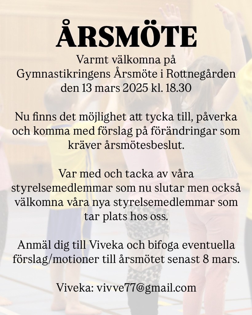 Varmt välkomna på Gymnastikringens Ảrsmöte i Rottnegården den 13 mars 2025 kl. 18.30.