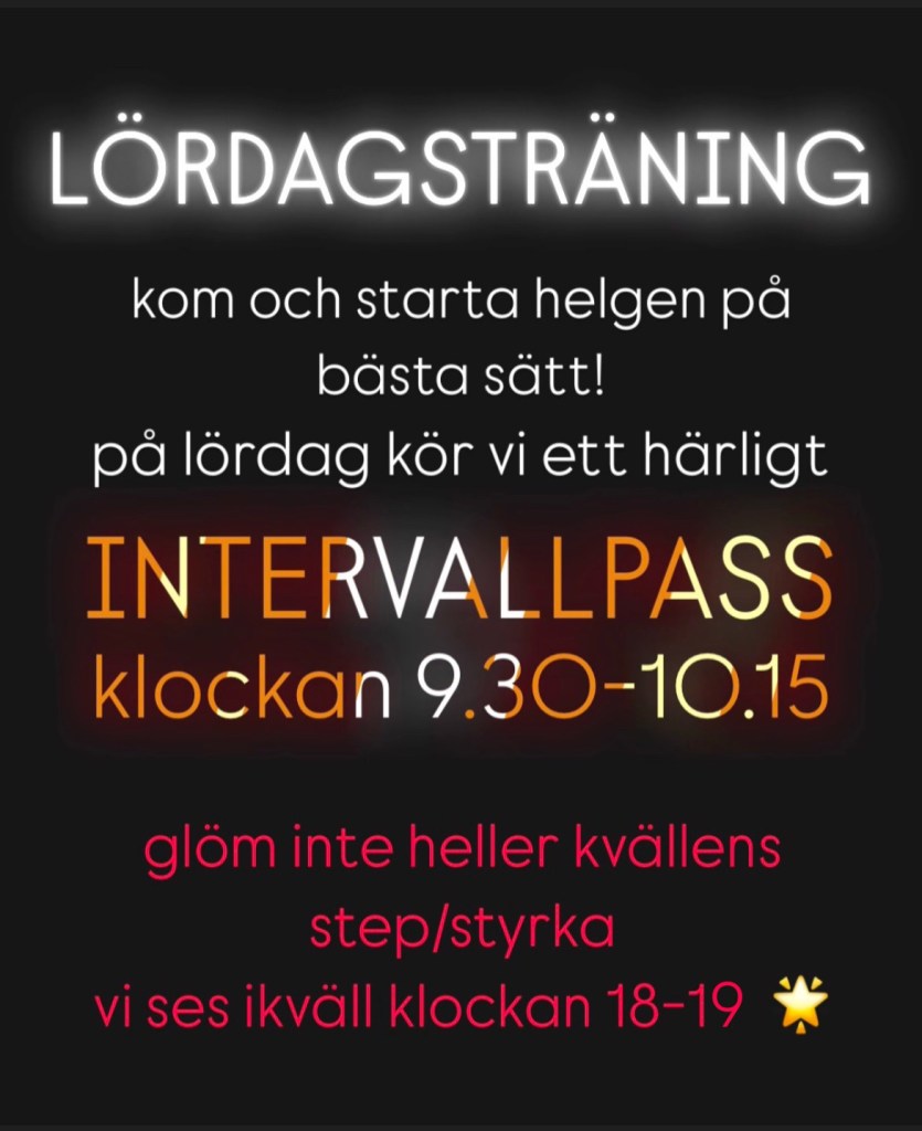 Utöver kvällens step/styrkepass klockan 18-19 kör vi på lördag ett svettigt och energipåfyllande Intervallpass 9.30-10.15 🤩
